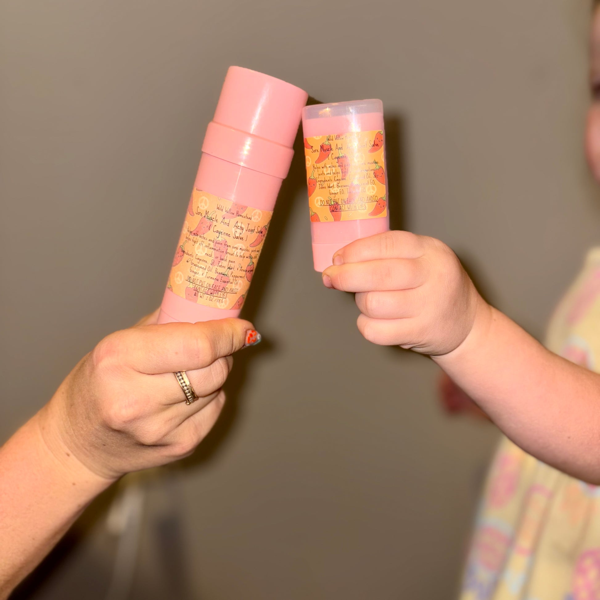 This is made with whole cayenne peppers, that have been ground down and macerated in Grapeseed oil, then combined with beeswax.